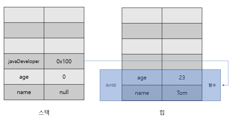 다음으로 객체가 실제 생성되는 new Developer()로 인스턴스화가 되면서 실제 힙에 Developer 클래스의 요소들이 생성된다. 이때 생성된 힙 메모리 주소는 0x100번지라고 가정한다. 또한 함수명은 생략하고 함수라고만 표기하였다.
