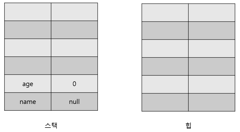 String name = null; int age = 0; |