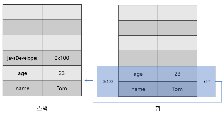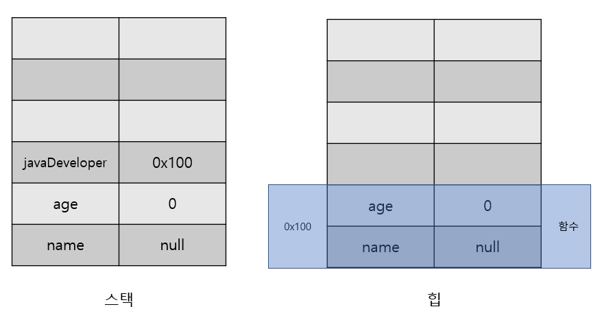 다음으로 객체가 실제 생성되는 new Developer()로 인스턴스화가 되면서 실제 힙에 Developer 클래스의 요소들이 생성된다. 이때 생성된 힙 메모리 주소는 0x100번지라고 가정한다. 또한 함수명은 생략하고 함수라고만 표기하였다.