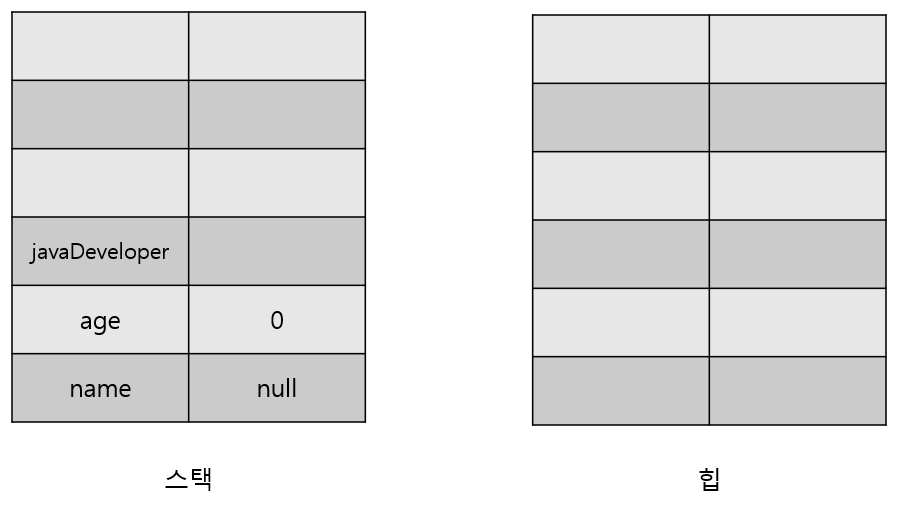 객체가 기본 생성자를 통해서 만들어졌기 때문에 추가적인 작업이 없이 마무리되었다. 따라서 최종적으로 아래의 구문이 끝나게 된 것이다. 이때 스택에 있는 javaDeveloper 변수에 객체의 위치 정보인 힙의 주소가 할당된다.